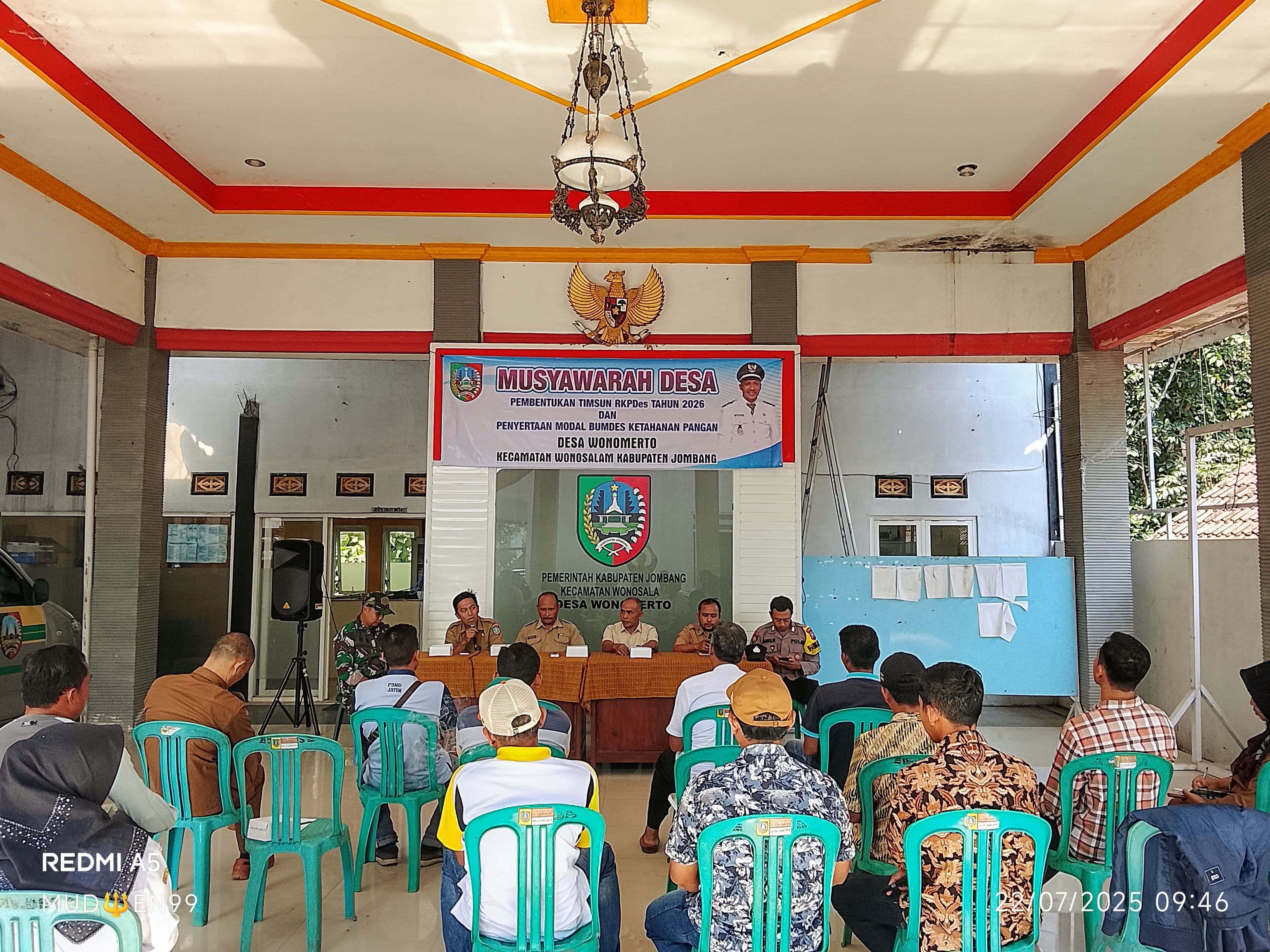 Selasa, 22 Juli 2025, Musdes Pembentukan Tim RKPDesa Tahun 2026 dan Penyertaan Modal BUMDesa Ketahanan Pangan dari Dana Desa Ds. Wonomertodihadiri oleh Tim Fasilitator Musdes kecamatan yaitu Kasi PMD dan Pendamping Desa. Dalam musdes tersebut menyepakati bahwa tim Penyusun RKPDesa 2026 Ds. Wonomertodiketuai oleh Bpk. Sekretaris Desa dan anggotanya Kepala Dusun dan 2 orang keterwakilan Perempuan desa. Kemudian Untuk Penyertaan Modal Katahanan Pangan dari Dana Desa akan digunakan oleh BUMDesa untuk Pupuk.